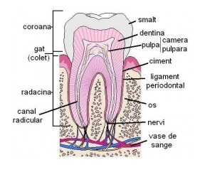 - Dintii sunt structurile cele mai dure din organismul uman, fiind folositi la muscarea, sfasierea si mestecarea alimentelor, ca un prim pas in digestie. Dintii au un rol si in vorbire, un proces controlat prin directionarea fluxului de aer in gura, cu ajutorul dintilor, limbii si a buzelor. Fiecare dinte are doua parti principale - coroana dintelui - partea vizibila de la suprafata - si radacina situata in maxilar. Aceste doua parti se intalnesc la gatul dintelui (colet), situat chiar sub marginea gingiei. - Coroana - Aceasta este partea vizibila a dintelui, situata deasupra marginei gingivale si acoperita cu smalt. Cu cat inaintam in varsta, dintii pot parea mai lungi. Acest fapt se datoreaza bolilor parodontale, care produc retragerea gingiei si dezgolirea dintelui. De asemenea, dintii pot parea mai mici, datorita tocirii smaltului. - Dintii incisivi au coroana cu capatul lat si ascutit, in forma unei dalte, iar caninii au capatul ascutit ca osageata. Molarii si premolarii presinta osuprafata mai plata, cu ridicaturi si adancituri. - Gatul dintelui - Numit si colet, este locul in care coroana intalneste radacina. - Radacina dentara- Radacina dintelui se extinde in osul maxilarului, iar forma sa depinde de tipul dintelui. Incisivii si caninii au o singura radacina, premolarii au o radacina sau doua, iar molarii pot avea doua sau trei radacini, in functie de locatie. Radacinile sunt acoperite de ciment si sunt sustinute cu ajutorul ligamentului periodontal. La capatul fiecarei radacini se afla un orificiu, numit foramen apical, prin care ies vase de sange si nervi. - Smaltul - Smaltul este invelisul exterior, dur, al coroanei dentare. Smaltul poate rezista fortei de mestecare, muscare si zdrobire, insa poate fi si foarte fragil. Este predispus la fisurare. Lezarea smaltului nu este dureroasa. Dintele nu poate repara singur smaltul, asa cum oasele rupte se sudeaza, prevenirea deteriorarii fiind esentiala. Smaltul este translucid (permite trecerea luminii) insa nu este transparent. Desi smaltul se afla la exterior, stratul de sub acesta - dentina - este responsabil de culoarea dintilor. Smaltul poate fi patat de cafea, ceai tutun si din cauza igienei deficitare. Medicul poate rezolva aceasta probema prin abraziunea smaltului sau prin alte metode ce implica afectarea dentinei. - Cimentul dentar - Asa cum smaltul acopera coroana, cimentul acopera radacina. Nu este la fel de alb sau dur precum smaltul, insa este atasat de mici fibre (ligamentele periodontale), care ajuta la ancorarea dintelui in maxilar. - Dentina - Dentina este o substanta asemanatoare cu osul, aflata sub smalt si care alcatuieste cea mai mare parte a dintelui. Pentru a schimba culoarea dintelui, este necesara schimbarea culorii dentinei. Culoarea dentinei este gri-alba sau galbuie, nu un alb pur. Petele pot fi produse de diverse boli, fluor, sau antibiotice, administrate in perioada de dezvoltare. Dentina inconjoara si protejeaza nervii si vasele de sange - pulpa - din coroana si radacina. Dentina este un tesut viu si transmite impulsuri dureroase. Se poate repara singura. - Pulpa dentara - In mijlocul dintelui se afla pulpa dentara, o cavitate ce contine vase de sange, nervi si tesut conector - pulpa. Pulpa hraneste dintele si asigura vitalitatea sa. Partea pulpei situata in radacina se numeste canal radicular, iar partea situata in coroana se numeste camera pulpara. Atunci cand este expusa infectiei, pulpa transmite durere severa si formeaza un abces dentar. In acest caz, pentru salvarea dintelui, este necesara extractia pulpei si obturarea canalului radicular. - Ligamentul periodontal - Radacina dintelui este atasata de osul alveolar prin ligamentul periodontal. Acest ligament contine vase de sange si nervi, constituind o zona de amortizare flexibila intre dinte si os. - Foramenul apical - Deschizatura mica de la capatul fiecarei radacini, care permite trecerea vaselor de sange si a nervilor. |